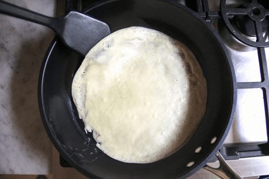 Crepes cooked in this pan came out without any hot or cold spots. While the taller sides require a bit more finesse with a silicone spatula, we were still able to successfully maneuver around the crepe to lift it from the pan. As one of the lighter pans we tested, the Kyocera was easy to lift in order to swirl crepe batter around. We also liked how the ergonomic handle provides a comfortable grip.