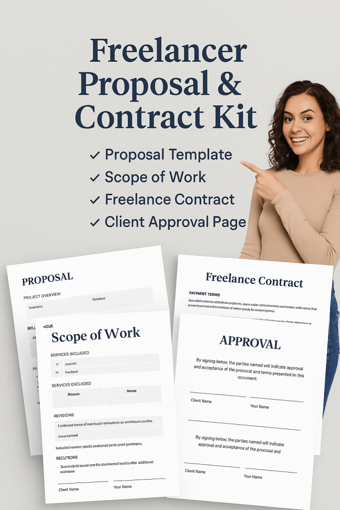 TL;DR: Most freelancers lose money and time before the project even begins. The Freelancer Proposal & Contract Kit Bundle solves this with a professional, ready-to-use proposal template + scope of work template + contract agreement + client approval form. It’s everything you need to land clients confidently, prevent scope creep, and protect your income.