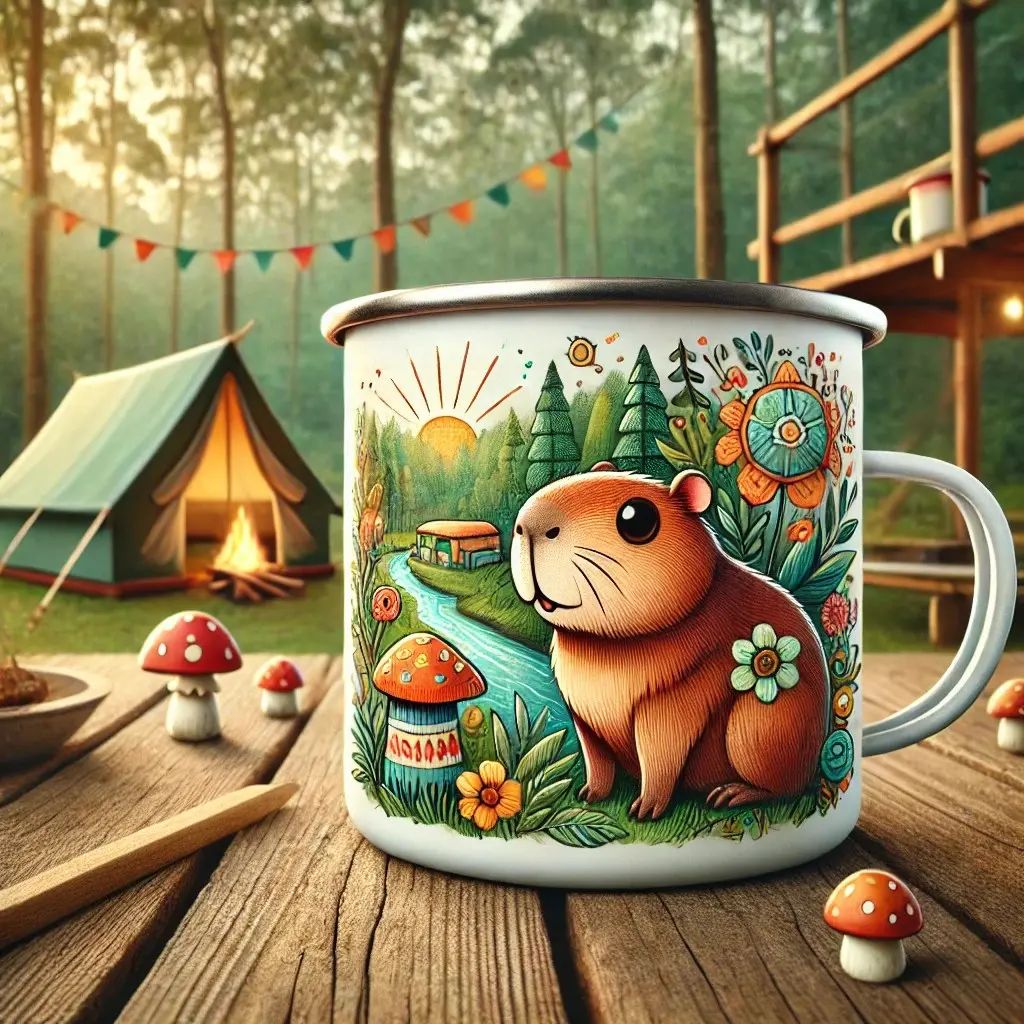 She used her existing character design, “Coffee Bara,” a cheerful capybara holding a cup of coffee, and incorporated a cozy camping theme to align with the enamel mug’s outdoor appeal. Tammy spent hours refining her illustration, ensuring it would resonate with her customers.